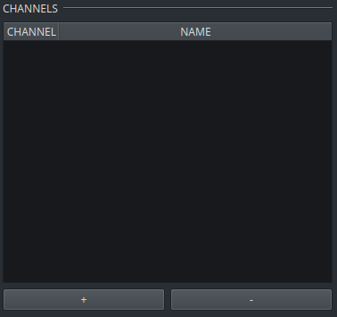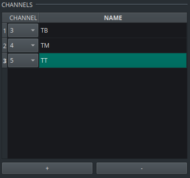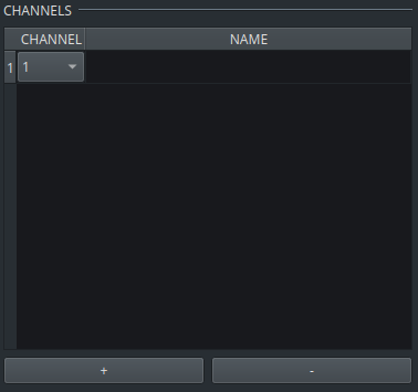 By clicking on the + button, a new row will appear. It consists of a dropdown containing the number of channel available and a text field were users can specify a name for this channel.