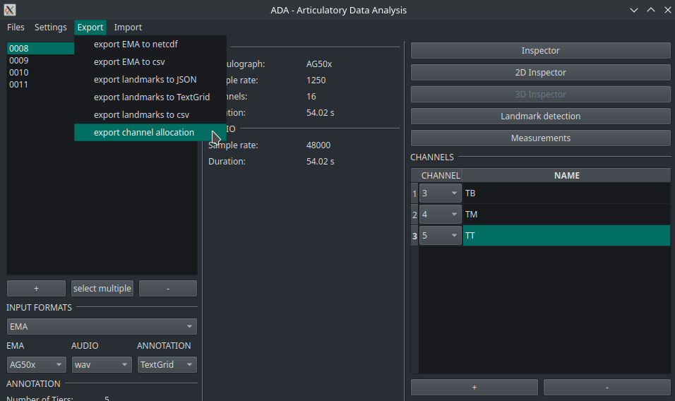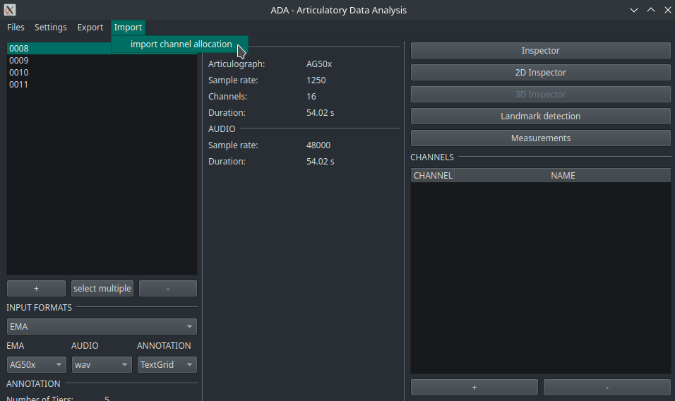 The channel information can then be imported into ADA. As a pre-requisite, import your data first and click on one of these files. This is necessary to access the number of channels stored in the EMA recording. The import itself is done by clicking on import at the top and then on import channel allocation: