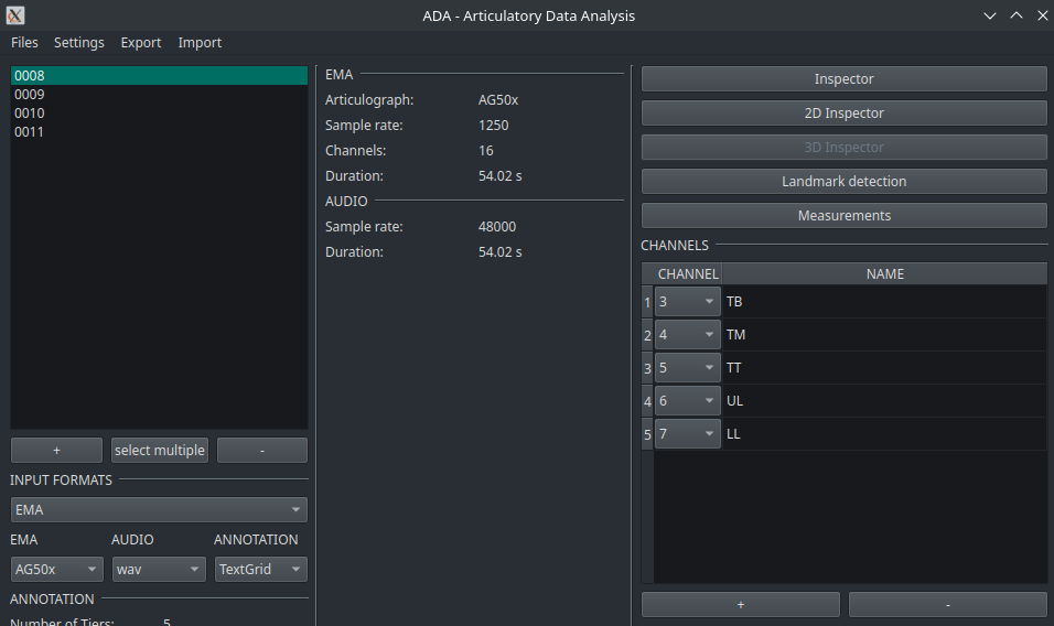 Once the data is loaded into ADA, it is necessary to specify the channels that will be used in the program. This channel information is used for the visualization, annotation, and measurements. The channel allocation is handled in the CHANNELS area that consists of a table with the channel and a corresponding name as headers.